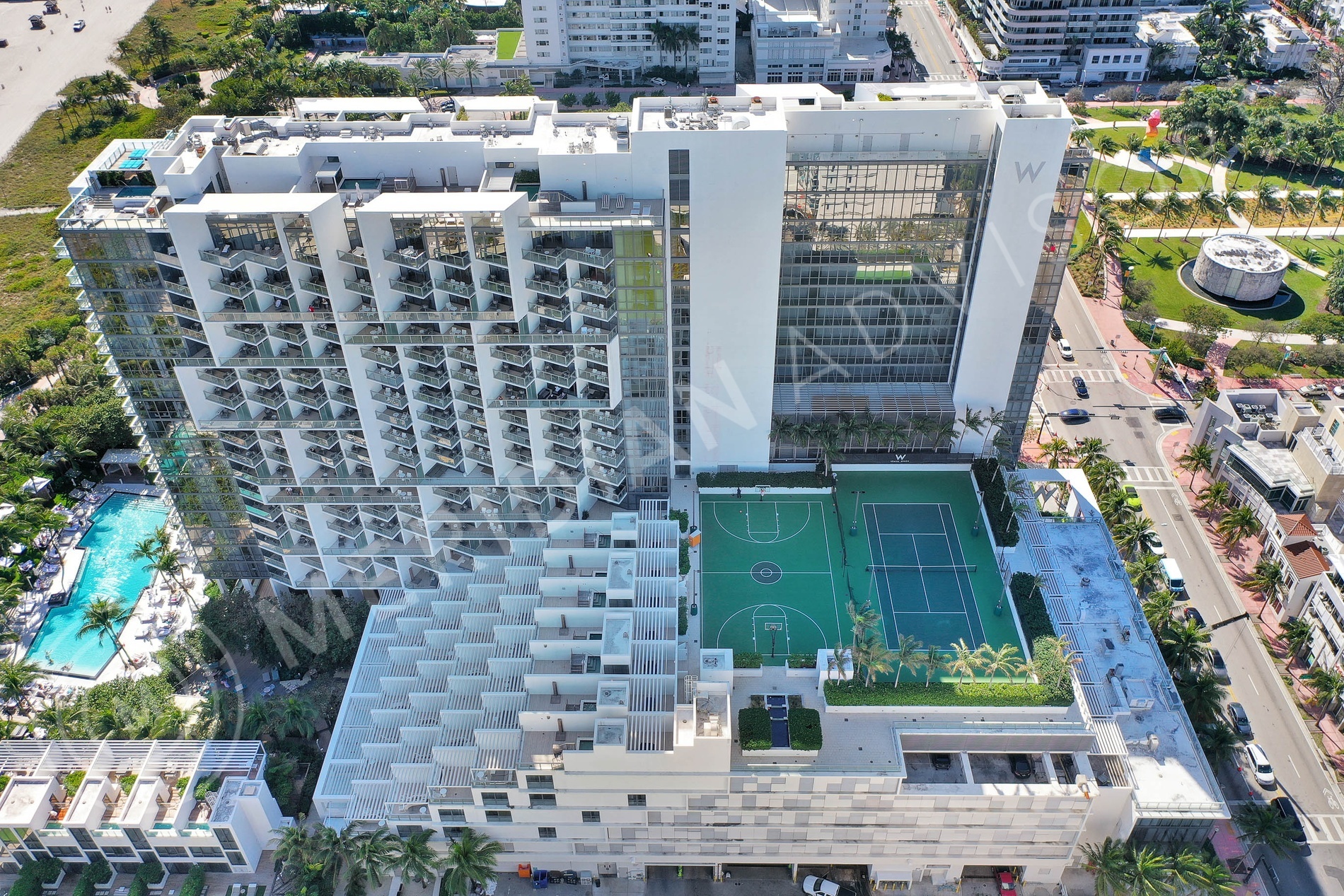 The W offers 300 feet of pristine oceanfront, two outdoor pools, private pool cabanas, a secret garden, the lavish Bliss spa, fabulous public spaces designed by Yabu Pushelburg, and spectacular dining options, including the famed Mr. Chow restaurant. It also contains Wall, one of the hottest nightclubs in Miami Beach. A unique amenity of the W is a rooftop sports complex, which contains basketball and tennis courts.